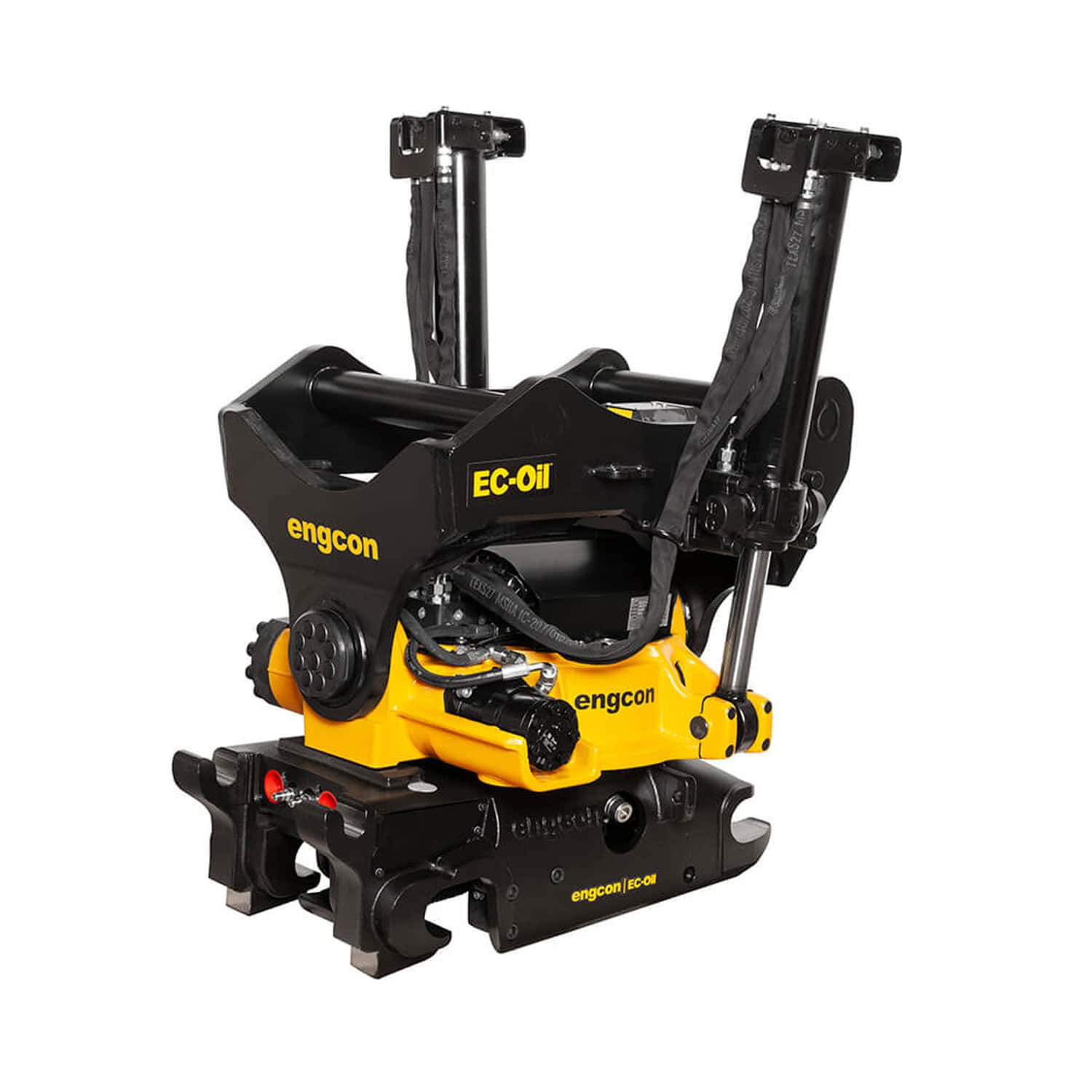 - EC-Oil, automatisch snelwisselsysteem voor het aan- en loskoppelen van een draaikantelstuk en hydraulische uitrustingsstukken zonder dat de machinist de cabine hoeft te verlaten