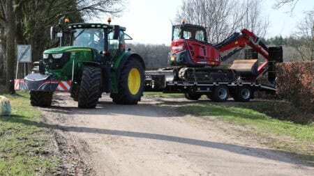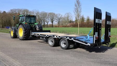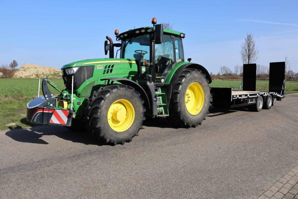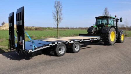 De trailer is robuust gebouwd en gemaakt van materialen van hoge kwaliteit. Dat helpt om het geheel stabiel te houden tijdens transport. Onder de wagen zitten dubbelluchtbanden in de maat 235/75-17.5 en twee 10 ton’s landbouwassen. In combinatie met de lucht beremming met ALR zorgt dit voor een gecontroleerde en stabiele rit tijdens het vervoeren van machines.