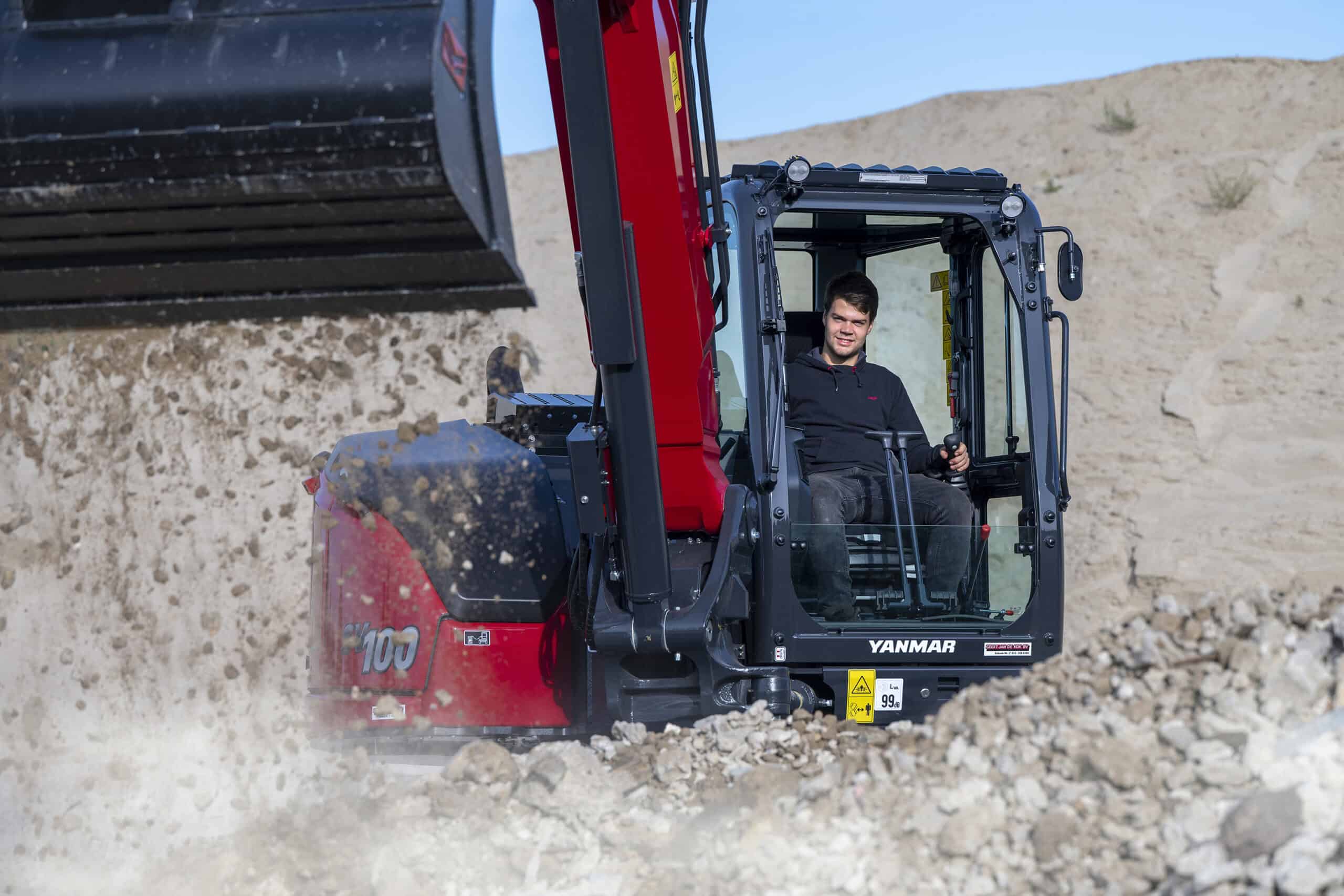 De 10.3 tons buitendraaier van Yanmar is speciaal ontwikkeld voor de Europese markt en biedt een flinke stap vooruit ten opzichte van zijn voorganger. Met meer motorvermogen levert deze machine indrukwekkende prestaties, zelfs onder zware omstandigheden. Wat direct opvalt, is de ruime en moderne cabine waarin comfort en functionaliteit samenkomen. Binnenin vind je handige opbergvakken, een USB- en 12V-aansluiting voor het opladen van apparaten en een overzichtelijk 7-inch kleurendisplay dat eenvoudig te bedienen is via een jog-dial of knoppen. De bediening van de machine is intuïtief en efficiënt, met proportioneel instelbare hydraulische functies via de joysticks. Voor extra gemak is het eerste hulphydraulische circuit voorzien van een drukverlaging via een tuimelschakelaar, en beschikt het dozerblad over een zweefstand. Met de hoogste uitbreekkracht in zijn klasse is deze machine klaar voor elke klus, groot of klein. Een echte krachtpatser die ook nog eens prettig werkt.